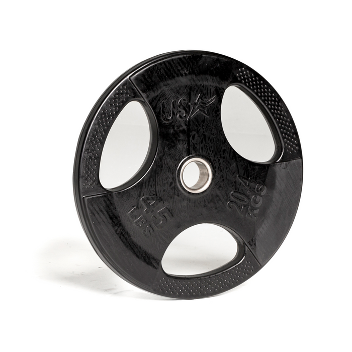 The USA rubber encased grip plate is here. This Olympic 2” grip plate has both the poundage marking as well as the KG markings for easily identifiable weight. A unique three hole grip with raised texture handles for a sure grip. This is also a branded plate with the USA SPORTS logo at the top to set this quality plate apart from others in the market. With the solid reputation of USA SPORTS, this item is the perfect addition to any home gym.