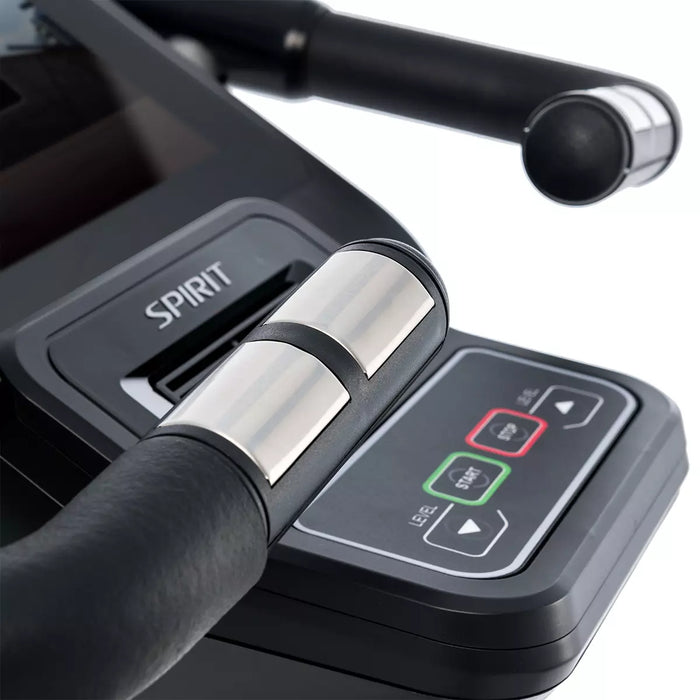 Wireless chest strap heart rate transmitter (sold separately) and heart rate pulse grips help keep workouts safe and effective.